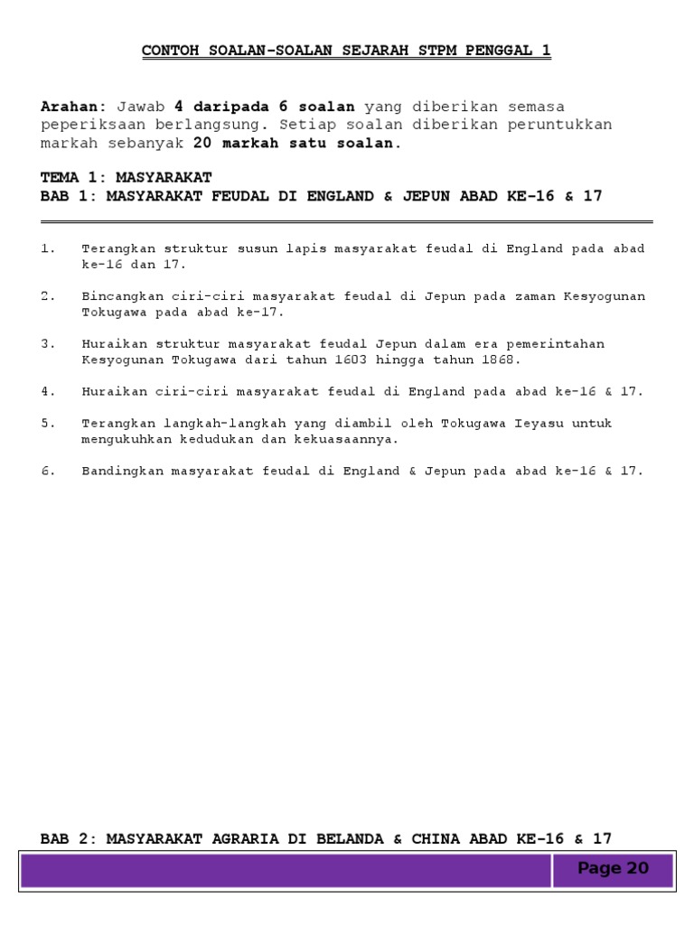 21 Sistem Beraja. 3 Masyarakat Feudal dalam Modul Pengajaran dan Pembelajaran STPM Sejarah Penggal 1 Putrajaya. Soalan-soalan telah disusun sesuai dengan topik yang terkandung dalam buku teks dan diikuti dengan penilaian yang berorientasikan peperiksaan STPM.