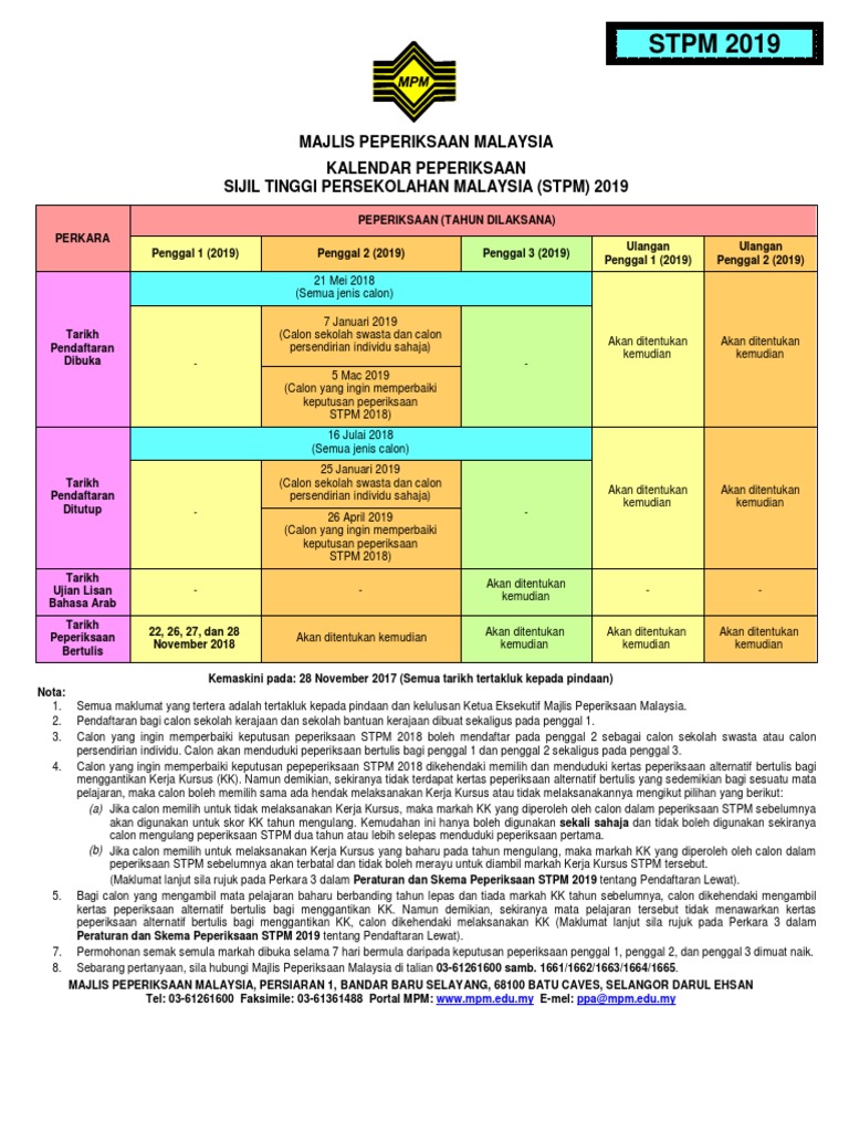 Tarikh Pendaftaran buka dan tutup. Tarikh Peperiksaan Stpm 2018 Penggal 1 2 3 Ulangan Penggal 1 2 Bumi Gemilang.